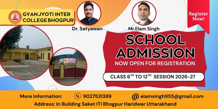 "ज्ञान ज्योति इंटर कॉलेज, भोगपुर (हरिद्वार) में कक्षा 6 से 12 तक प्रवेश प्रारम्भ। आधुनिक शिक्षण, अनुभवी शिक्षक, छात्रवृत्ति योजनाएं और सर्वांगीण विकास की गारंटी। अभी संपर्क करें!"